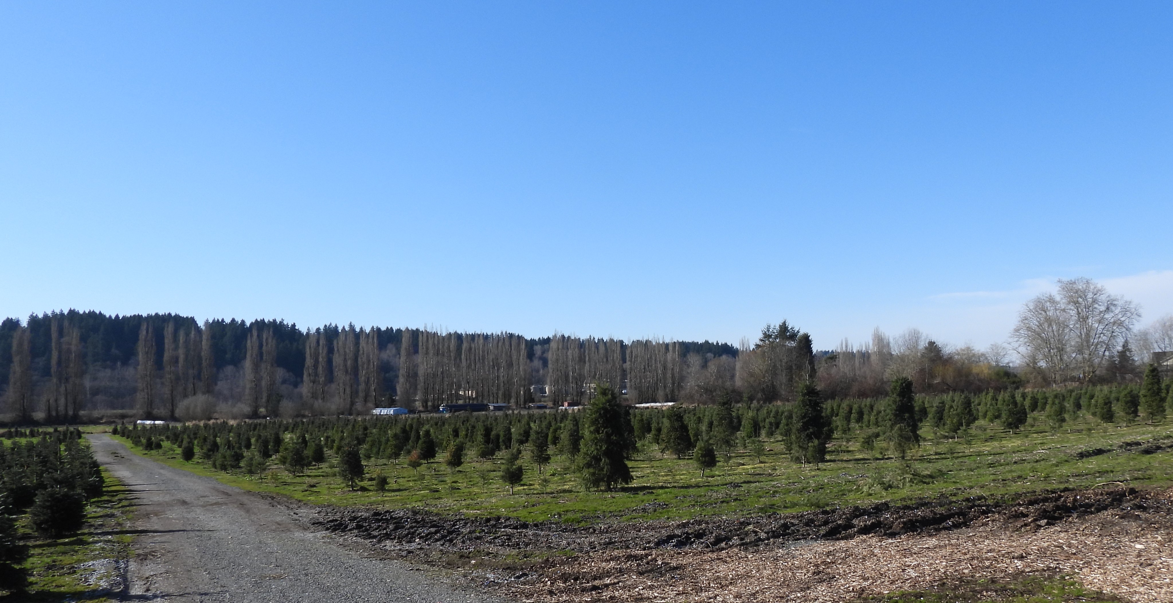 It is actually a Christmas Tree/ Pumpkin Patch working farm. Since it is winter we had the place to our selves. No hookups, but we have a generator and are fully contained so we are fine here. Love the view of the christmas trees Boomer walks the trails on leash and loves the smells! The property hooks up to a trail that will connect with the winerys to the north.